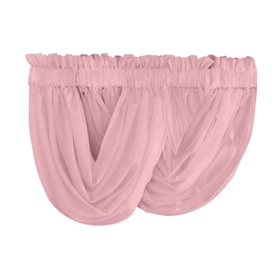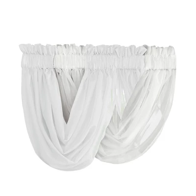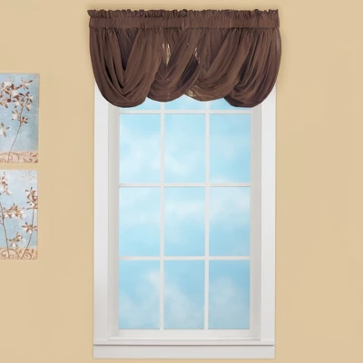 This beautiful sheer scoop valance makes it easy to get a designer-look for less! Sheer fabric lets the light in while adding privacy, and rod pocket tops make hanging easy. Machine wash. Polyester; imported. Set includes 2 valances of the same color choose 2 sets to achieve an alternating look. 35″ x 55″. Colors available in Chocolate, Sage, White, Taupe, Blue, Cream, Lilac, Burgundy or Rose.