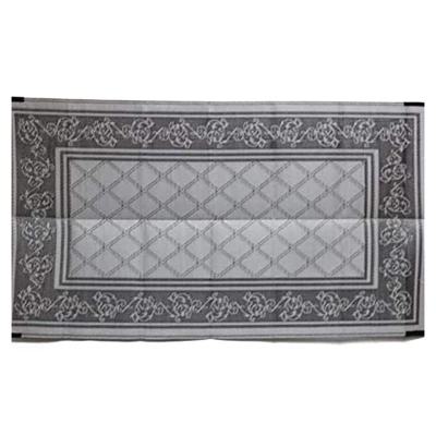 Bring extra smooth surface space on your next adventure with the EEZ-RV Products Reversible Outdoor Mat for Patios and RVs. This heavy-duty reversible patio and RV mat is constructed of tightly woven polypropylene and treated to resist sun and weather damage, providing you with extra surface space for sitting, storing shoes, sitting up outdoor eating spaces, and more. The fully reversible mat has a unique design on each side that is stylish and functional with a textured finish that provides traction and prevents slipping. The edges are treated with a heat gun and seen with a durable band that includes nylon loops at each corn for extra durability and transportability.Use the included nylon loops and ground stakes to create a sturdy outdoor space at your campsite that won’t shift in the wind. The breathable mat is easy to clean by sweeping or spraying with water. Easy to transport with the included carrying bag and designed to prevent damage to grass or wooden decks, you’ll love having this versatile pad along with you on your next trip. Create the perfect outdoor space in a snap with the Reversible Outdoor Mat for Patios and RVs from EEZ-RV Products.