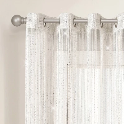 This is more than just a window curtain. These glimmering threads create a panel that can also be styled as a room divider, hanging doorway or even a photo backdrop. With this curtain, there is no other decorative competition. The Lush Decor Night Sky String Thread Grommet Window Curtain Panel is a versatile addition to your decor, crafted from 100% polyester, with decorative metallic thread woven in the string. A mix of white and shimmering silver metallic threads make this impressive visual possible. With this one purchase you can decorate a part of your home with captivating shine and have the ultimate photo backdrop for any occasion. Your guests will love passing through this curtain as an eclectic doorway alternative, a hanging room divider, or as an entrance for a walk-in closet. Hang this panel at your next wedding ceremony or any other glamorous party for a celebratory event backdrop. This panel is easily hung with the silver grommets at the top. Simply slide a curtain rod through the 1.65″ diameter metal grommets to effortlessly hang it over your window, across a doorway, or onto any structure for a striking photo backdrop. This curtain measures 52 inches wide by 63 inches long and is sold as single panel. We recommend gentle care for this curtain, hand wash separately in cold water and hang to dry. Do not wring or iron this window panel. Please refer to label for full care instructions.
