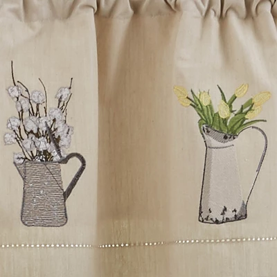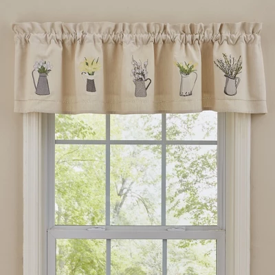 Introduce a country charm to your farmhouse home decor with this stitched valance curtain. Features embroidered antique milk pitchers filled with a variety of greenery such as cotton, tulips, and more against a beige ground. This cotton window treatment has a 1.5 inch header and 2 inch rod pocket.